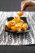 Melt butter or margarine in a frying pan. Put in peaches and remaining ingredients. Put on lid and cook until tender (not very long).