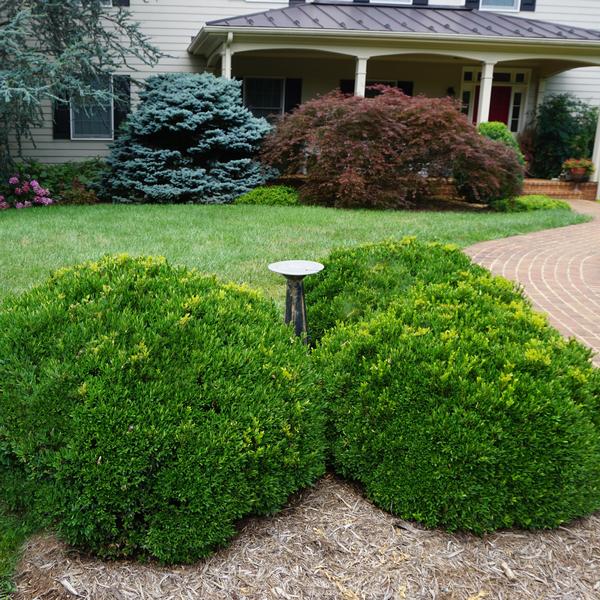 A compact, mounding to rounded boxwood that is very versatile. Foliage is deep green in summer and winter. Responds well to pruning if a small hedge is desired. Leave unpruned and a beautiful rounded habit will form. Deer resistant.